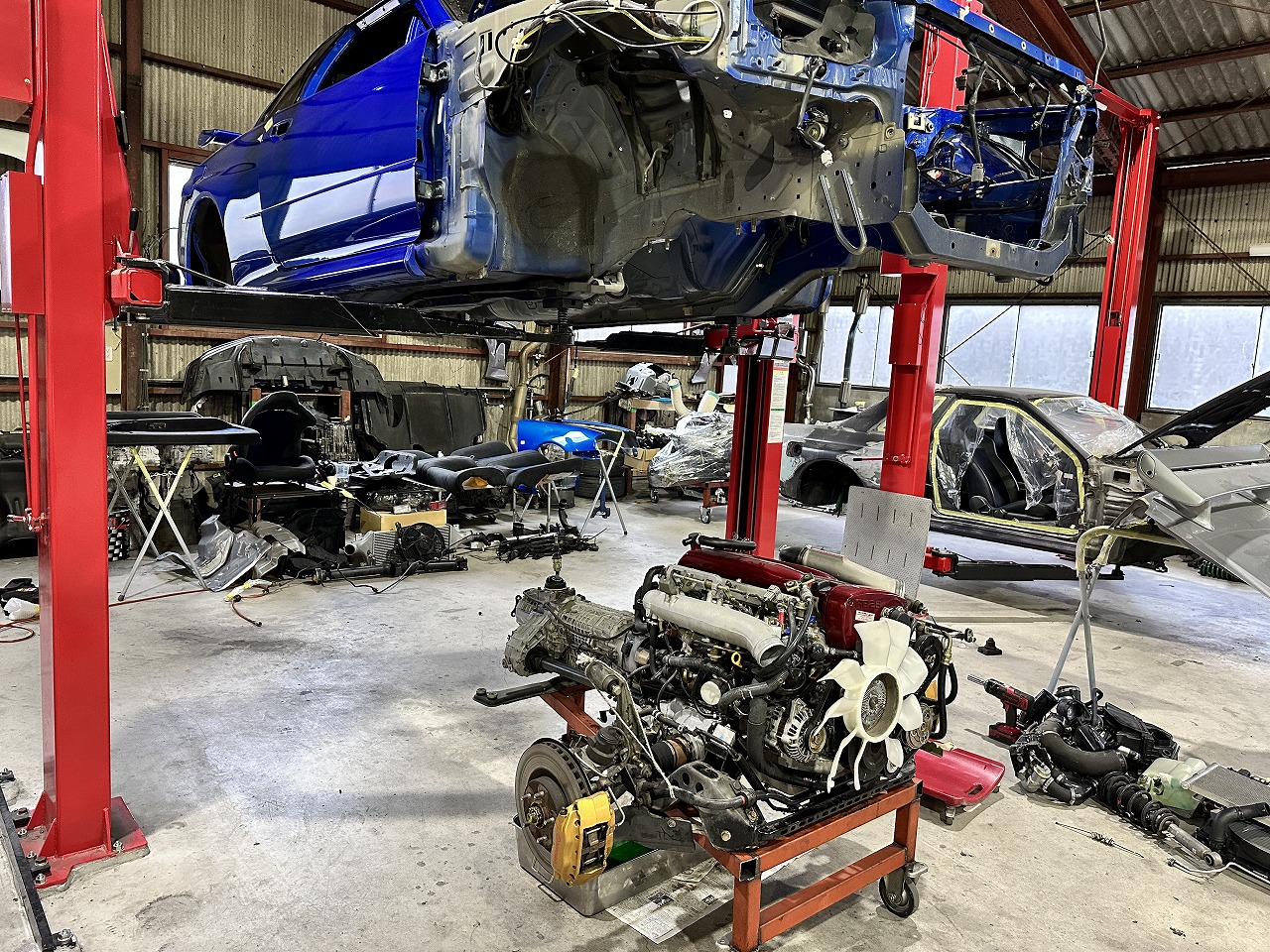 リフトの前には下地塗装済みで自然乾燥期間中のR34とその前はこれから作業開始のBBL車両になります。あとは作業進行中のR32が2台です。