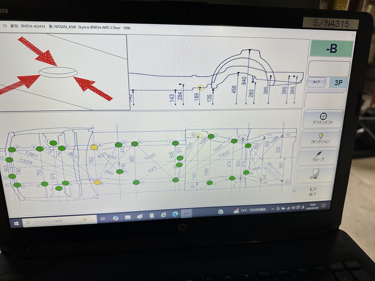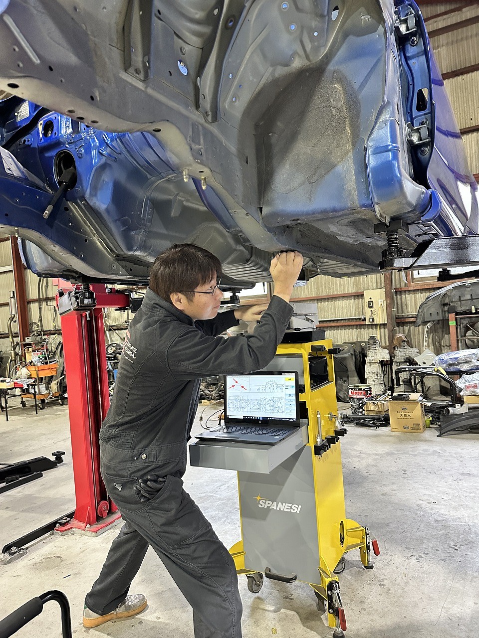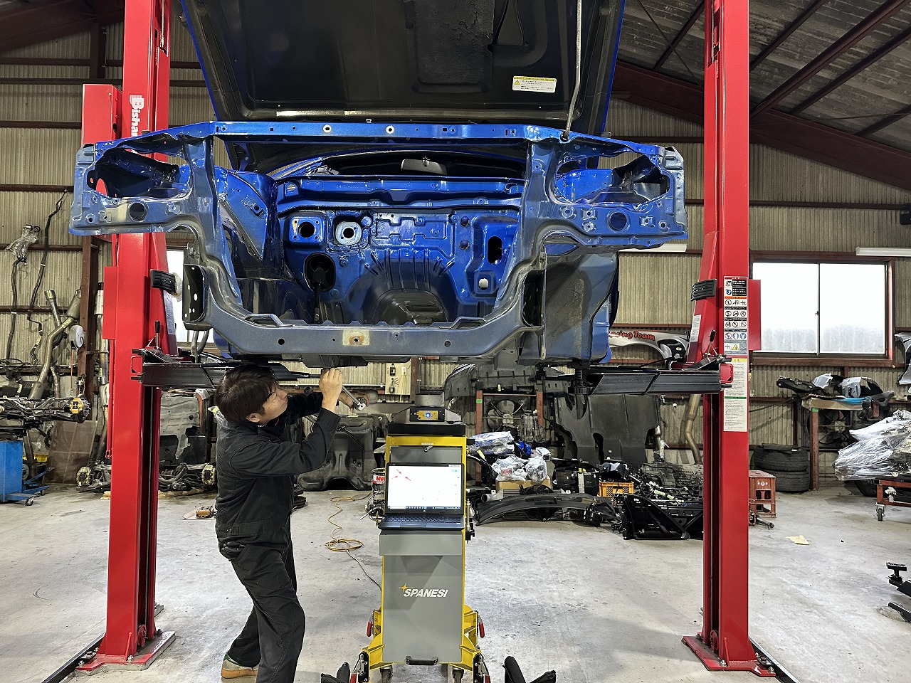 ここでは修復歴の有無ではなく現在のボディフレーム、骨格が適正は位置にあるのか、つまり歪んでいないかを計測します。