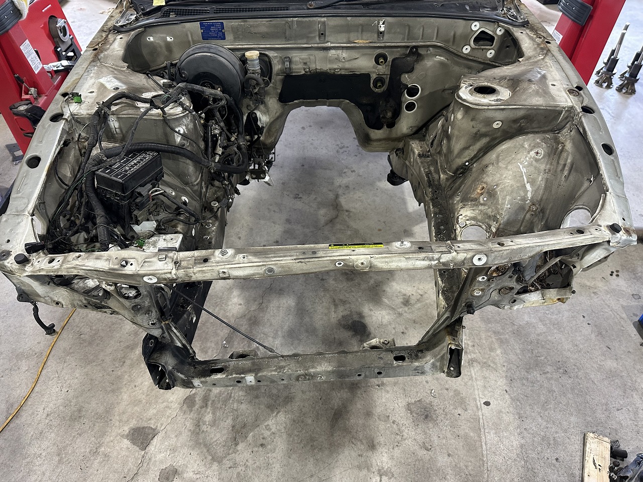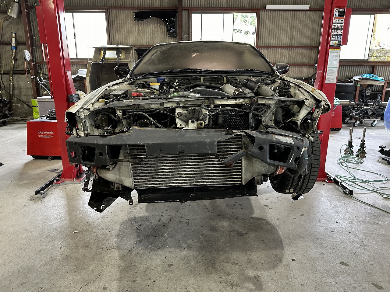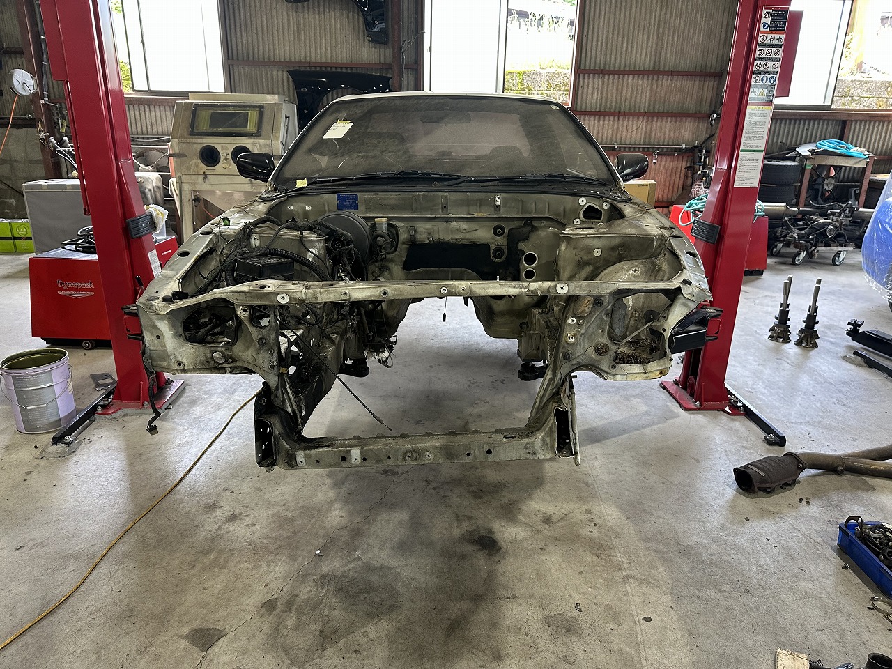 修正の為にBNR32専用ジグに車両を載せます。